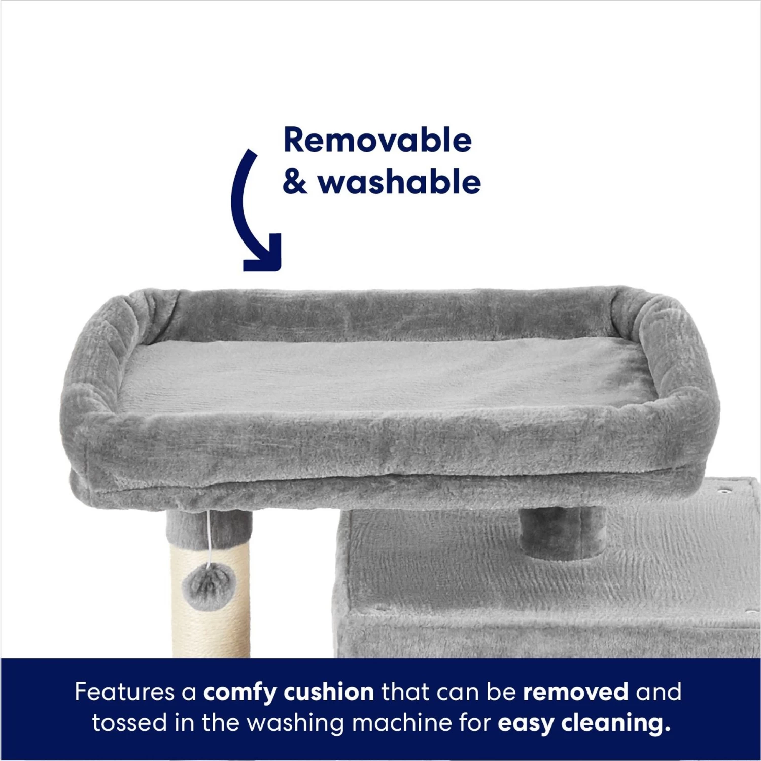 - Includes two condos, an extra-large top perch with removable, machine-washable bolstered bed, and sisal-wrapped scratching posts.