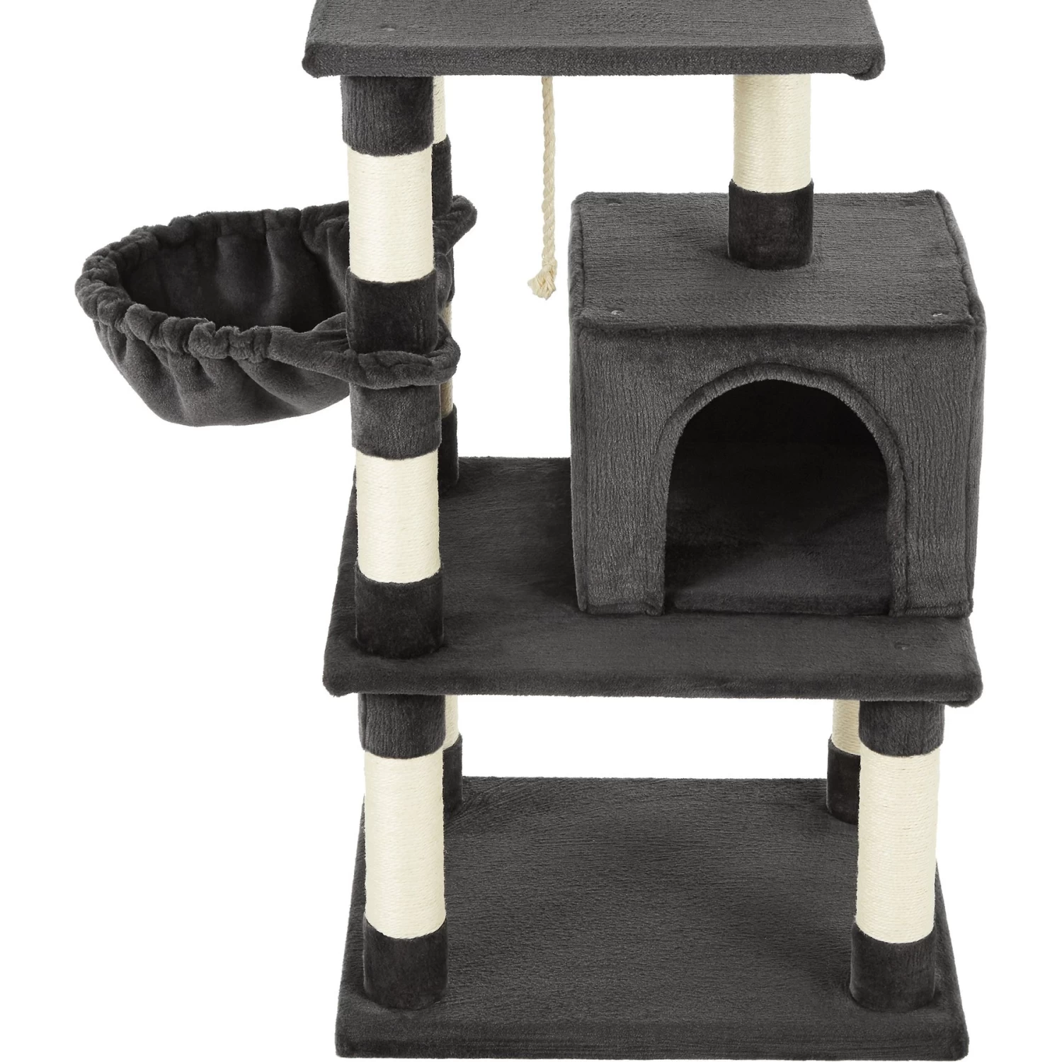 - This cat tree has all your kitty’s needs covered by providing cozy spots to relax in, a hideout to retreat to at their leisure, scratching and perching opportunities, and playtime fun.
