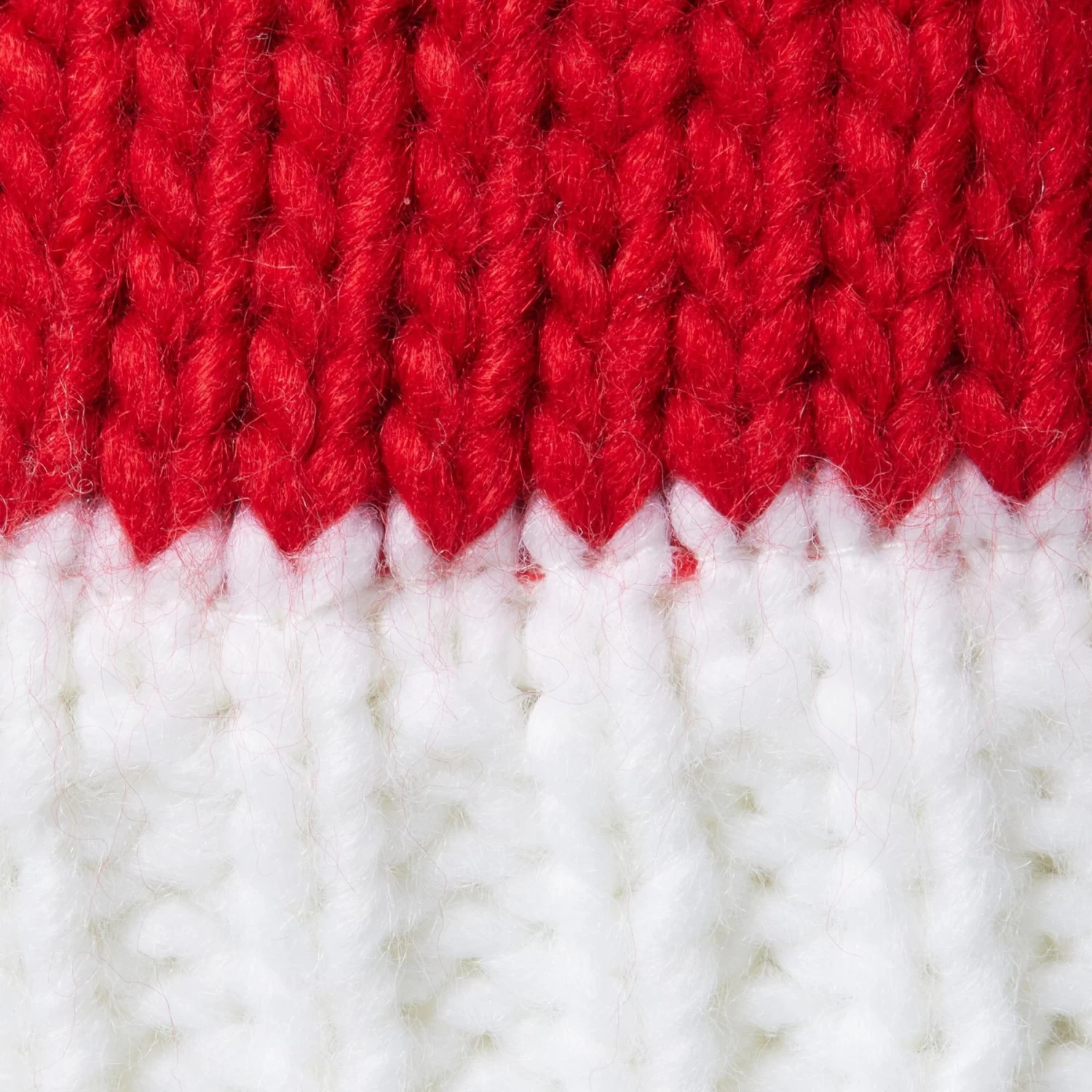 - Red, knitted Santa hat has white trim, candy cane-striped tassels, and white pom-pom accent ends.