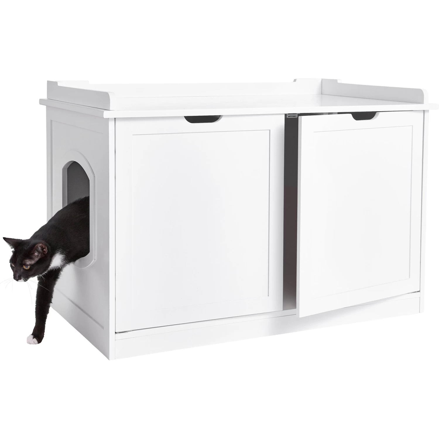 plus built-in doors with hinges that open wide for easy access to the litter box. - Includes removable divider that can be set up in 3 different positions to store essentials like food, treats, cleanup tools or left out to maximize interior space.