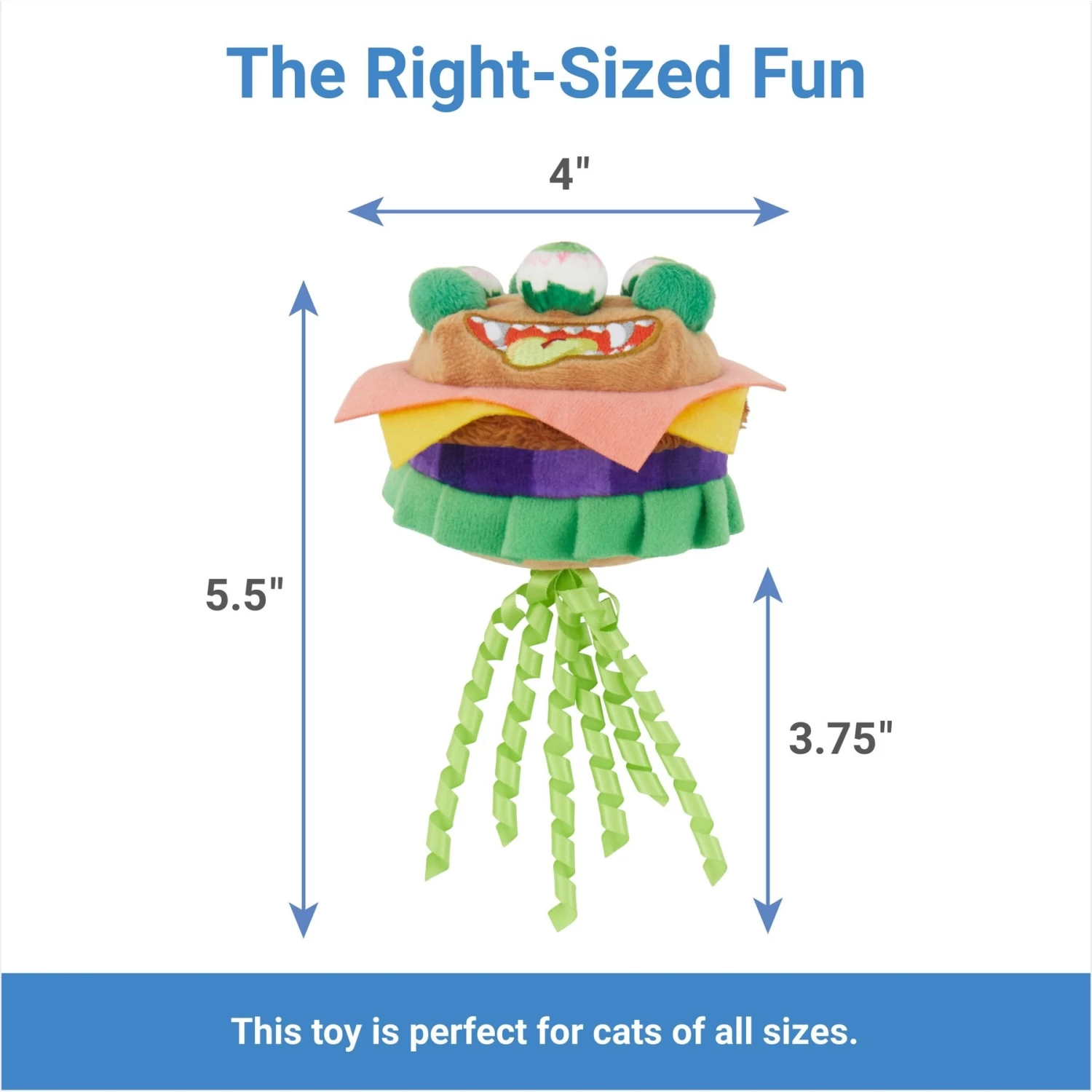 - Frisco Halloween haunted burger plush cat toy is everything your cat needs to funnel their energy into loads of playtime games.