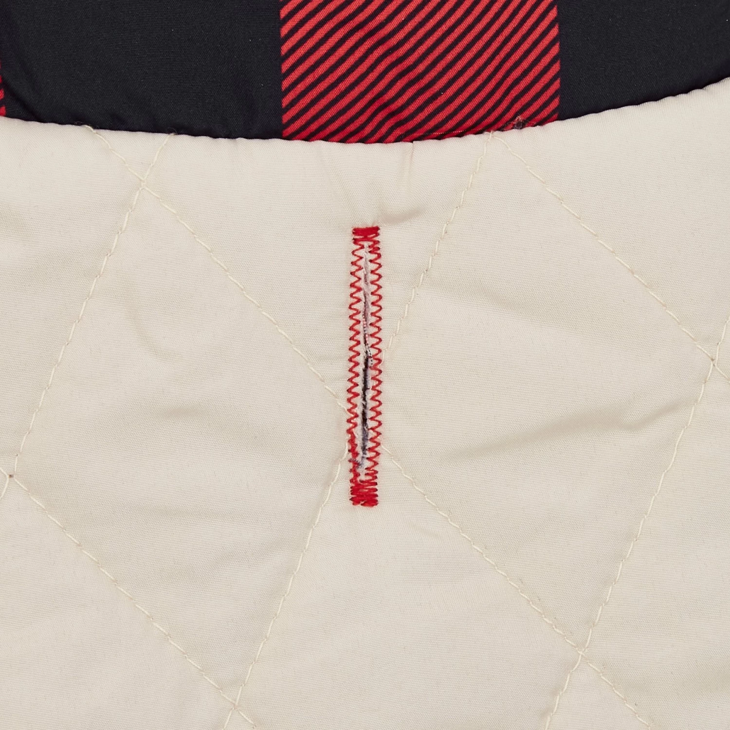 - The reversible design of this quilted jacket features a chunky red check on one side and solid beige on the other.