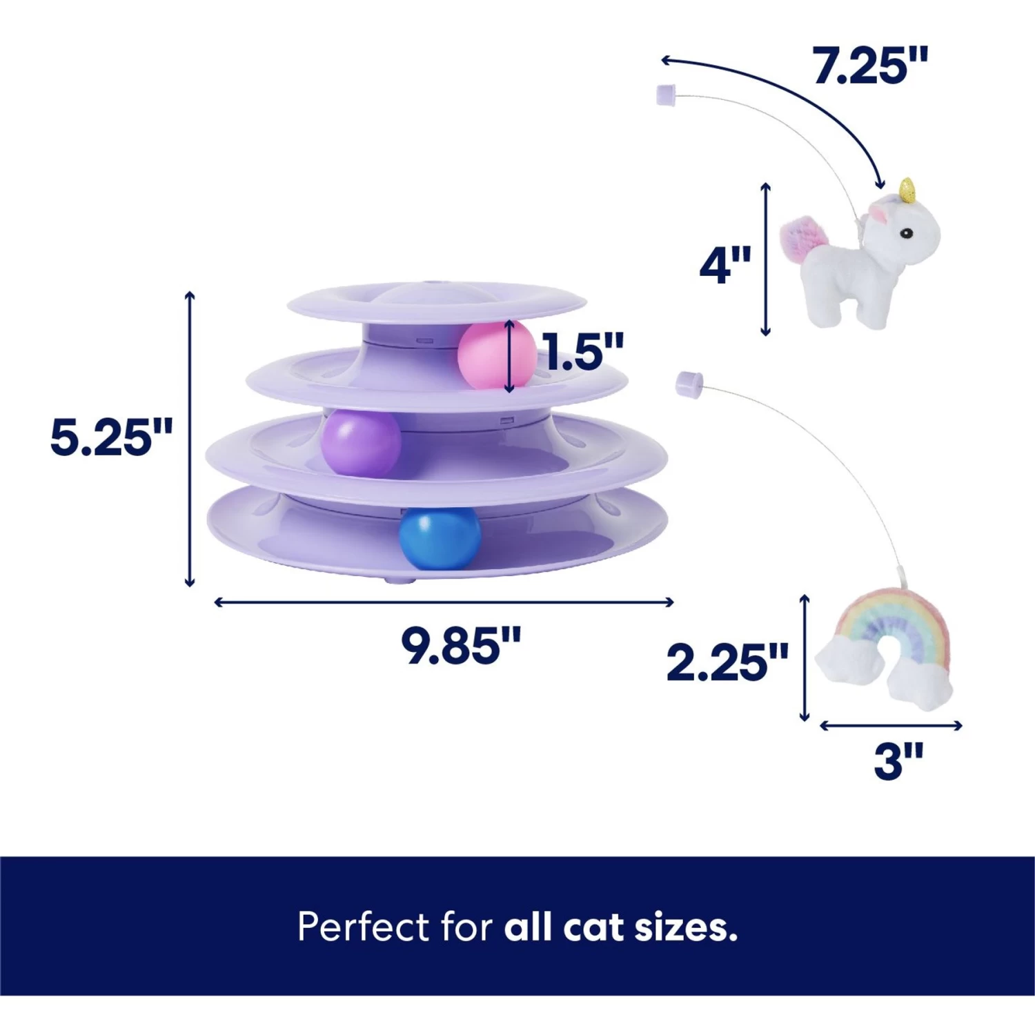 - Includes three-tier track, three colorful balls, and unicorn and rainbow pieces that include catnip inside.